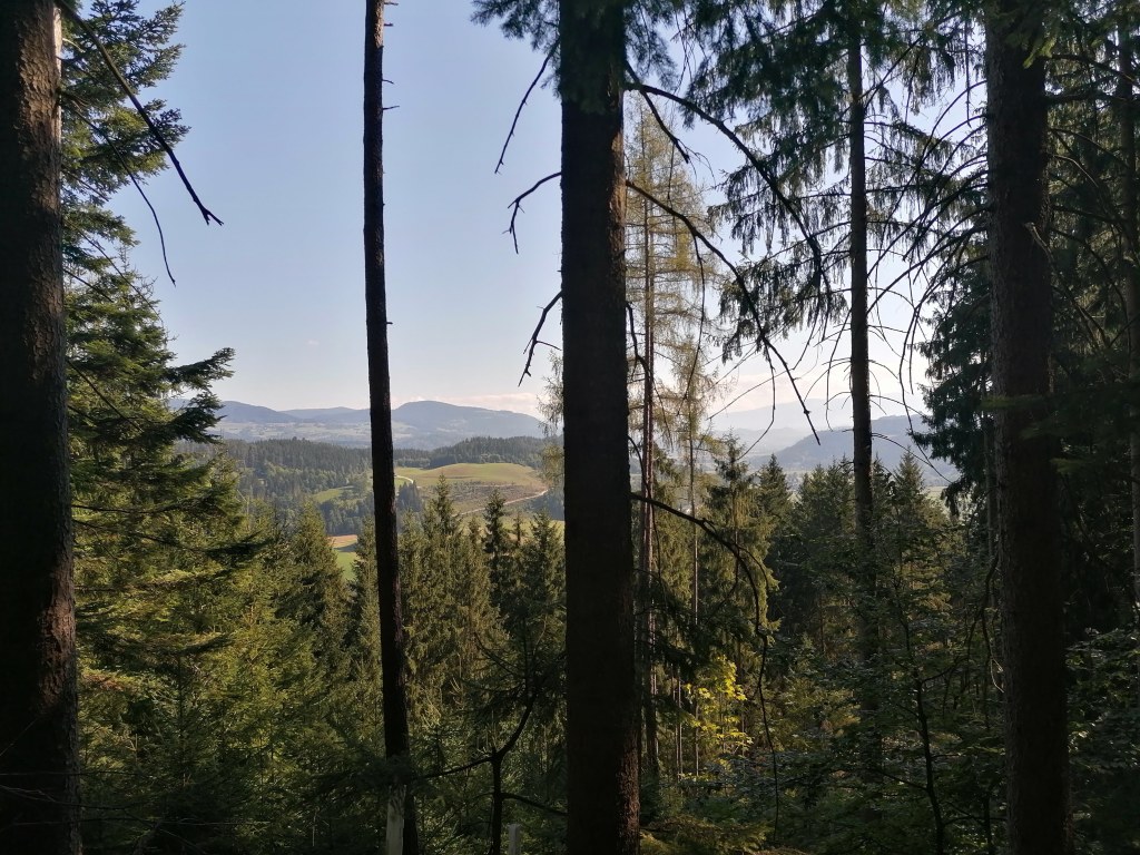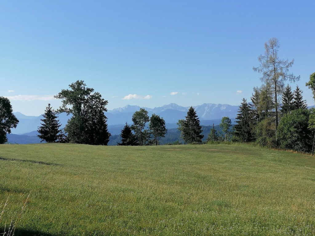 Und so machte ich mich eines morgens auf den Weg und schlug an einer Wegkreuzung eine andere Richtung ein. Der Weg war dann zwar an ein paar Stellen steil und nicht so gut zu laufen, aber je höher ich kam desto schöner wurden auch die Aussichten zwischen den Bäumen. Als es dann wieder langsam bergab ging und ich den Wald verließ, tat sich ein wunderschöner Ausblick in Richtung Karawanken auf. Oberhalb von Großbuch schnaufte ich ein paar mal durch und genoß die Aussicht.