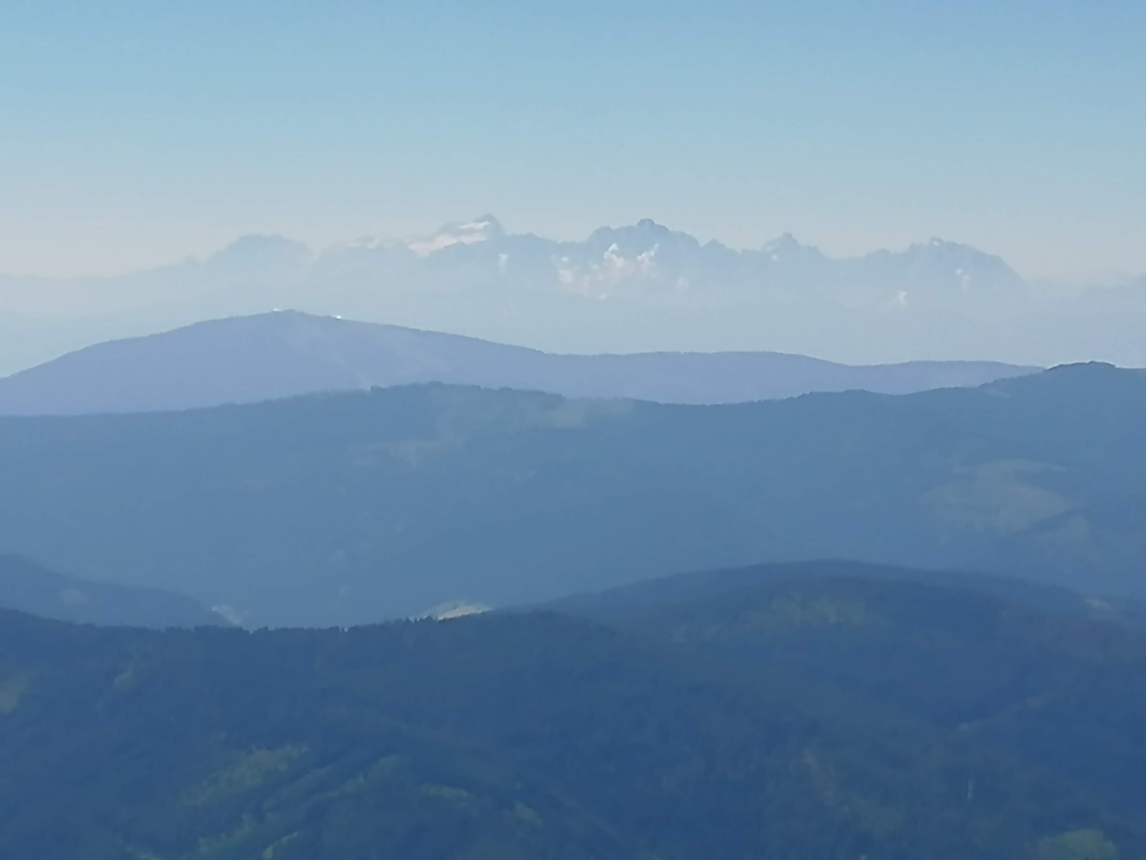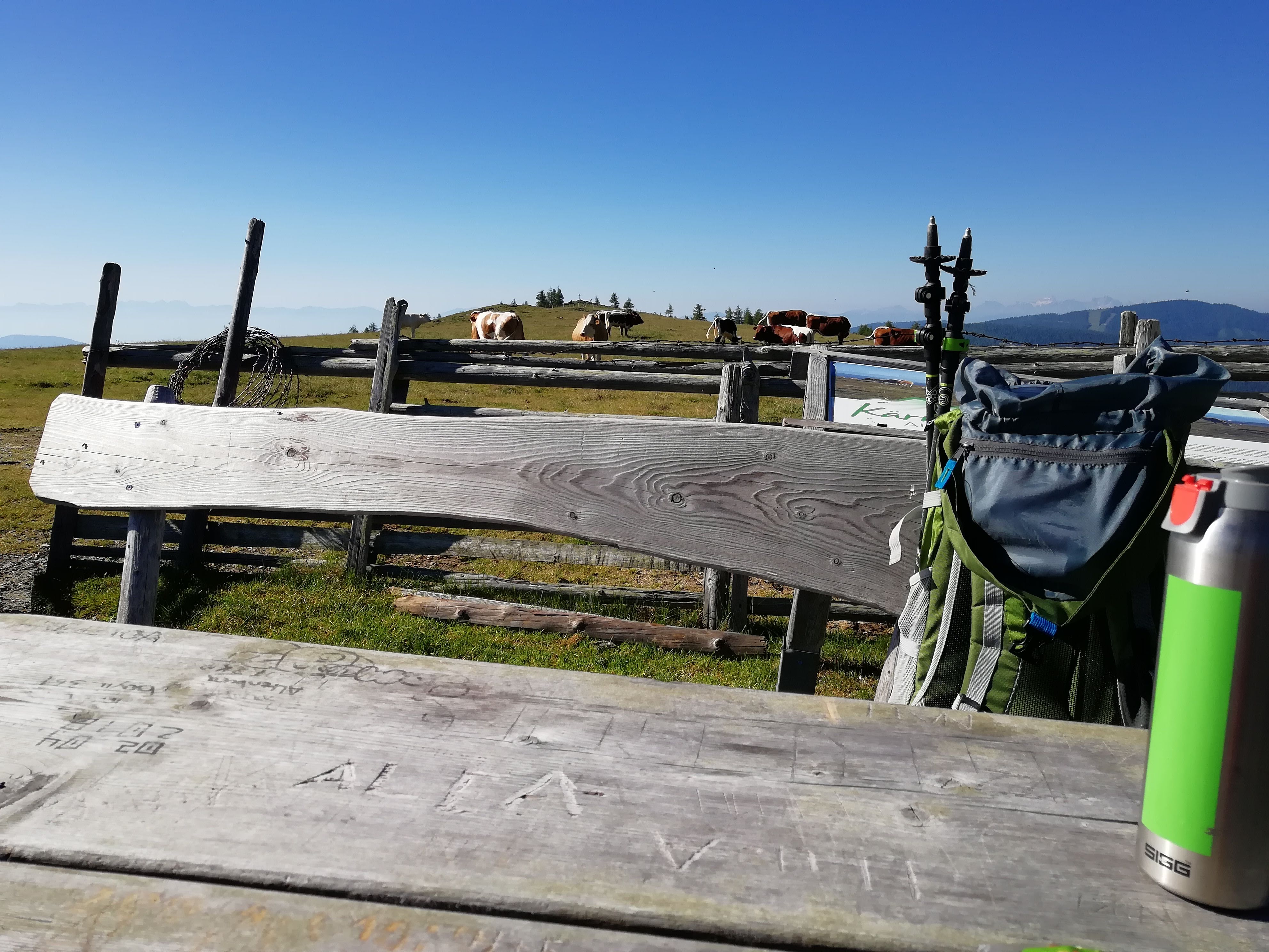 Trailbaby hatte ihren Spaß, denn der Panoramaweg war nicht nur voller Touristen, sondern auch voller Pferde, Kühe und einen Esel haben wir auch getroffen. Die Aussicht ist wirklich wunderschön und je höher man kommt desto weiter kann man sehen. Auf der einen Seite Richtung Ossiachersee, Wörthersee, Faakersee und Drau – auf der anderen Seite Richtung Julische Alpen. An diesem Tag war die Fernsicht nicht so gut, es war ziemlich heiß und dunstig.