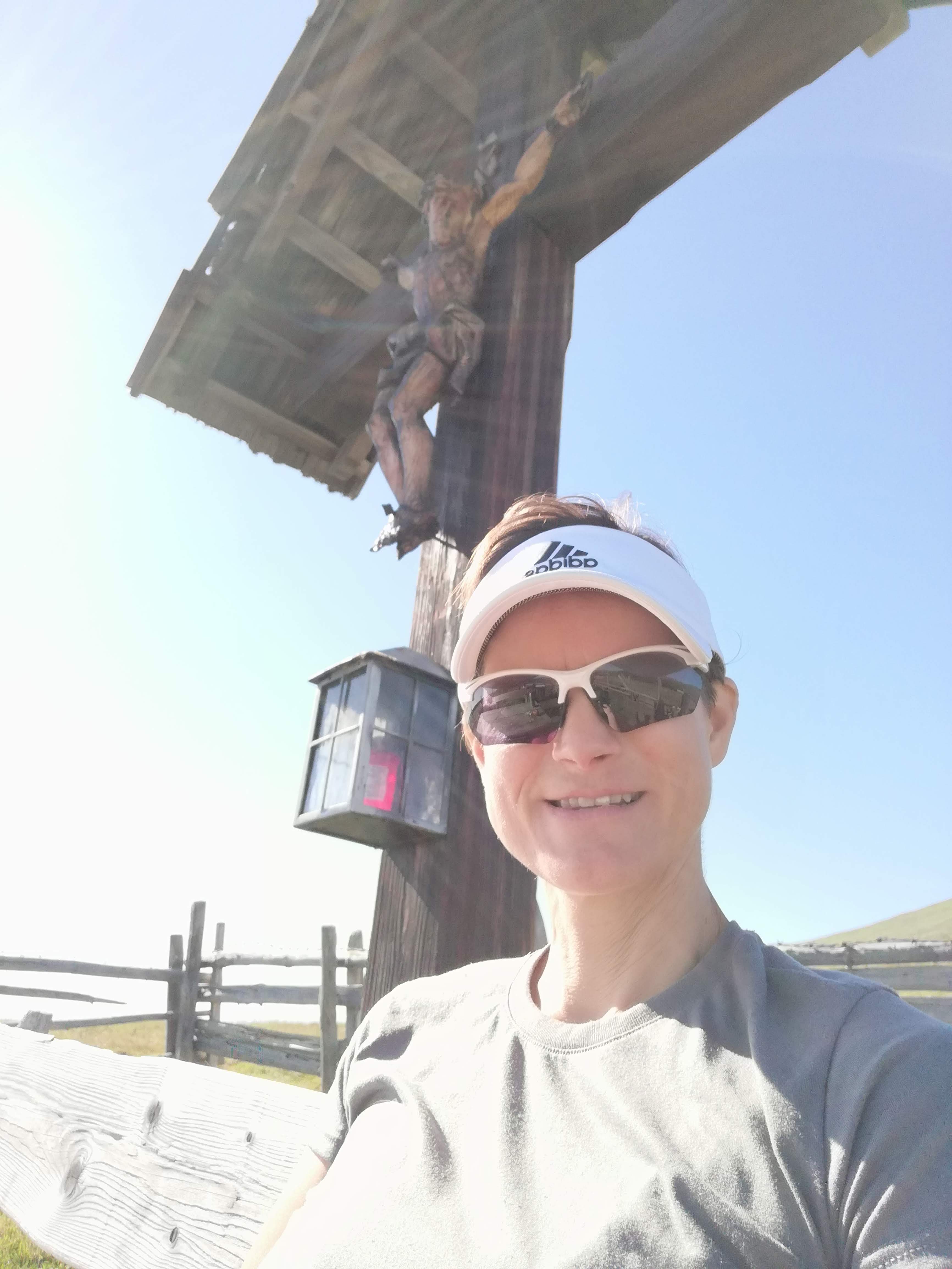 Nach circa einer Stunde Wandern wurde Trailbaby ungeduldig und hatte ihren Spaß daran mir Stirnband und Sonnenbrille vom Kopf zu zupfen. Außerdem wurde sie ziemlich schwer, weil sie so unruhig war. Also machten wir auf dem Plateau unterhalb des Gipfels Rast, immerhin wurden wir mit einem tollen Blick auf den Sendemast und das Kircherl am Gipfel belohnt. Wir genossen unsere Jause und Trailbaby konnte ein bisschen herum spazieren.