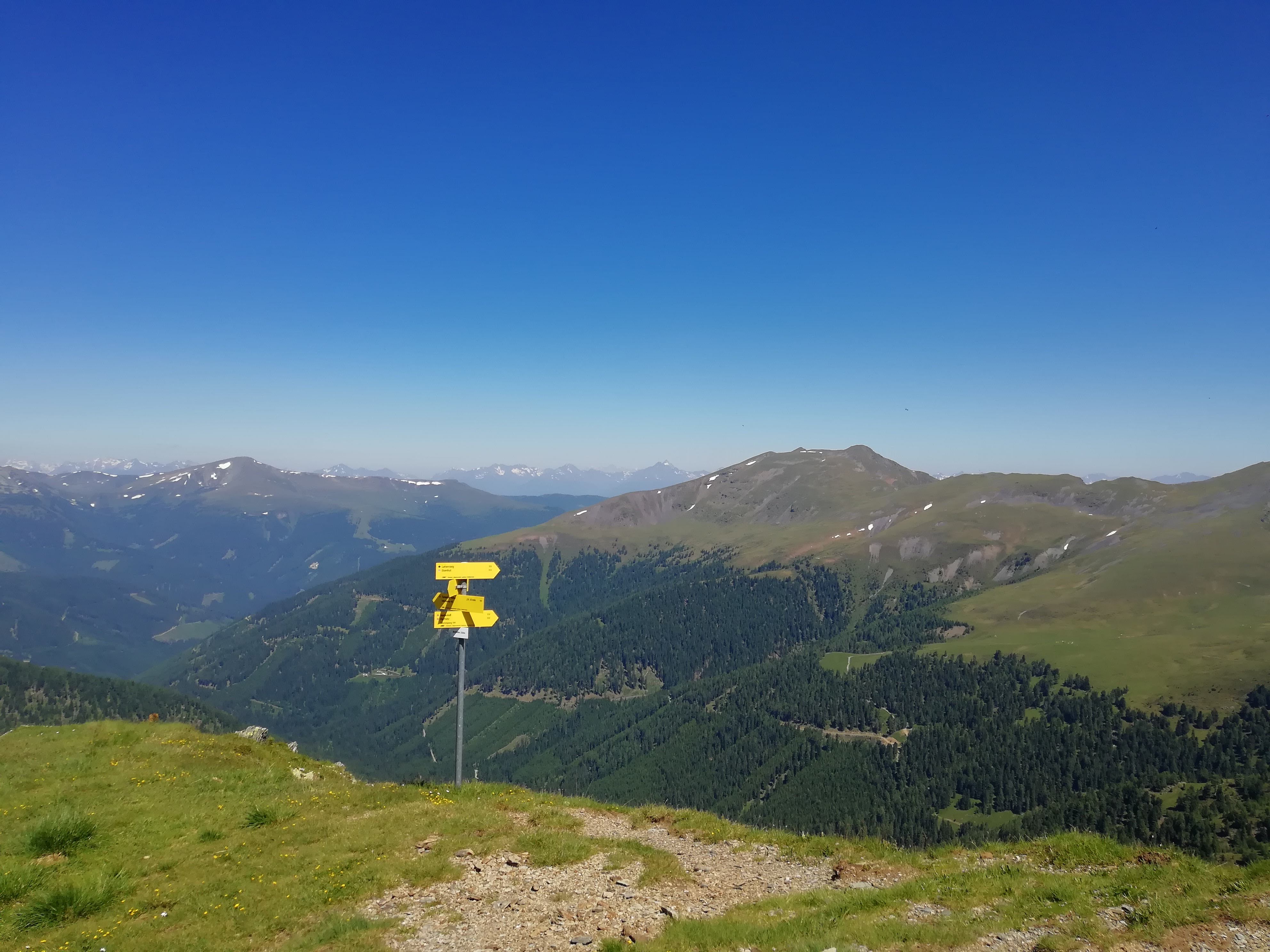Nachdem ich mich über die Homepage der Villacher Alpenstraße informiert hatte bei welcher Hütte auch ein Spielplatz dabei ist fiel die Wahl auf die Aichingerhütte als Ausgangspunkt. Von dort führt ein Wanderweg auf den Panoramaweg zum Gipfel des Dobratsch. Ich beschloss auf dem Panoramaweg zu bleiben, auch wenn das eine Schotterstraße mit sehr vielen Touristen war. Den anderen Wanderweg, der direkter zum Gipfel führte traute ich mich allein mit Kind in der Kraxe und ohne Stöcke dann doch nicht zu.